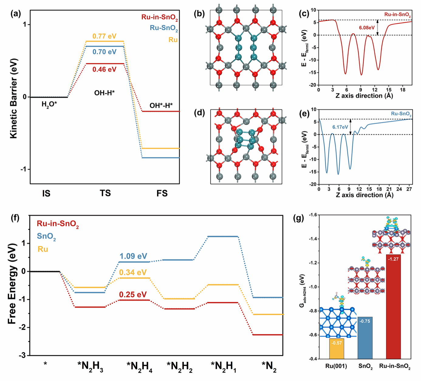 图6. 基于DFT计算的水解离与肼氧化反应机理深入剖析。(a) 在Ru(001)、Ru-in-SnO2和Ru-SnO2表面计算的水解离能垒 (IS: 初始态;TS: 过渡态;FS: 终态),限域结构显著降低了水分解的能垒。(b) Ru-in-SnO2的原子结构模型和 (c) 其计算的功函数。(d) Ru-SnO2的原子结构模型和 (e) 其计算的功函数。两者差异表明限域结构在界面诱导出更强的内置电场。(f) 在Ru(001)、Ru-in-SnO2和SnO2表面的HzOR自由能图,限域结构有效降低了决速步(*N2H4去氢化)的能垒。(g) 计算的N2H4在不同表面的吸附能。插图:N2H4吸附构型的差分电荷密度等值面,揭示了Ru-in-SnO2表面独特的端对双齿吸附模式是其高活性的关键。