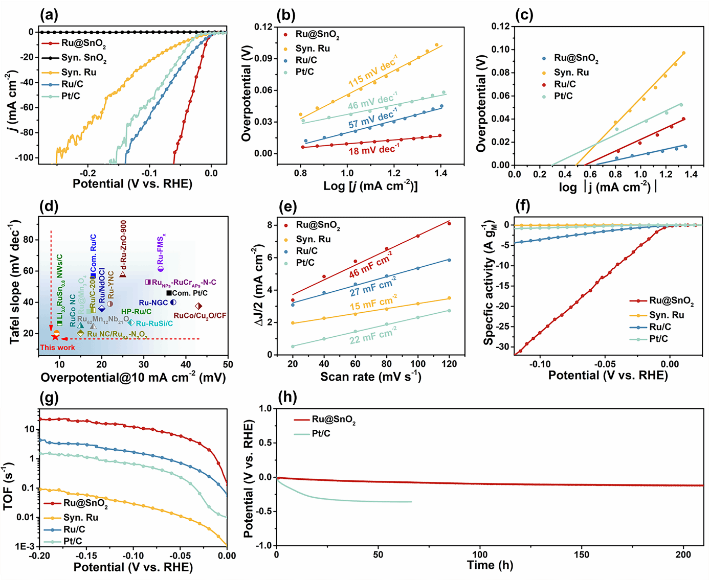 图3. Ru@SnO2在碱性介质中的析氢反应性能评估。(a) Ru@SnO2、实验室自制的SnO2与Ru、商业Ru/C及Pt/C催化剂的HER极化曲线。(b) 从极化曲线推导出的相应塔菲尔斜率图。(c) 通过塔菲尔曲线外推法得到的交换电流密度。(d) 将Ru@SnO2在10 mA cm⁻²电流密度下的过电位和塔菲尔斜率,与近期报道的优秀Ru基HER催化剂进行性能对比。(e) 通过循环伏安法测得的双电层电容,用于评估电化学活性面积。(f) 基于贵金属质量计算的质量活性及 (g) 在100 mV过电位下估算的转换频率,用于评估本征活性。(h) 在10 mA cm-2恒定电流密度下的计时电位法长期稳定性测试。