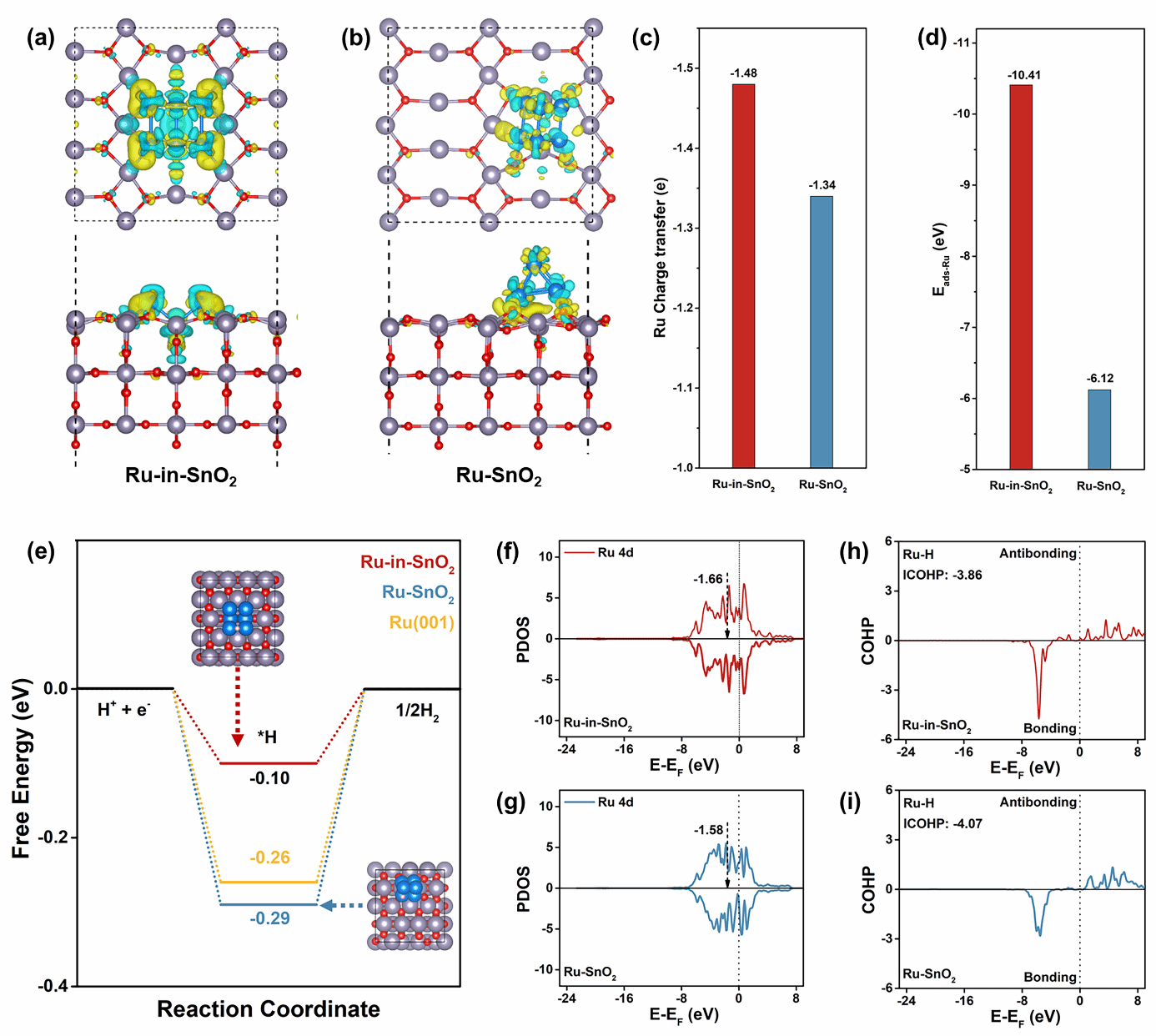 图5. 基于DFT计算的电子结构调控与氢吸附行为机理研究。(a) Ru-in-SnO2 (晶格嵌入) 和 (b) Ru-SnO2 (表面负载) 模型的差分电荷密度等值面 (黄色代表电子积累,青色代表电子耗尽),直观展示了界面处的电荷转移。(c) 计算的从Ru到SnO2载体的电荷转移量及 (d) Ru在载体上的吸附能,证明了嵌入结构具有更强的界面相互作用与稳定性。(e) 在Ru(001)、Ru-in-SnO2和Ru-SnO2表面计算的氢吸附自由能,晶格限域效应优化了ΔG*H,使其更接近于零。(f) Ru-in-SnO2和 (g) Ru-SnO2中Ru 4d轨道的投影态密度,限域结构引起d带中心下移,削弱了氢吸附。(h) Ru-in-SnO2和 (i) Ru-SnO2中Ru–H键的晶体轨道哈密顿布居数曲线,负的ICOHP值更小,证实了限域结构中Ru–H键的弱化。
