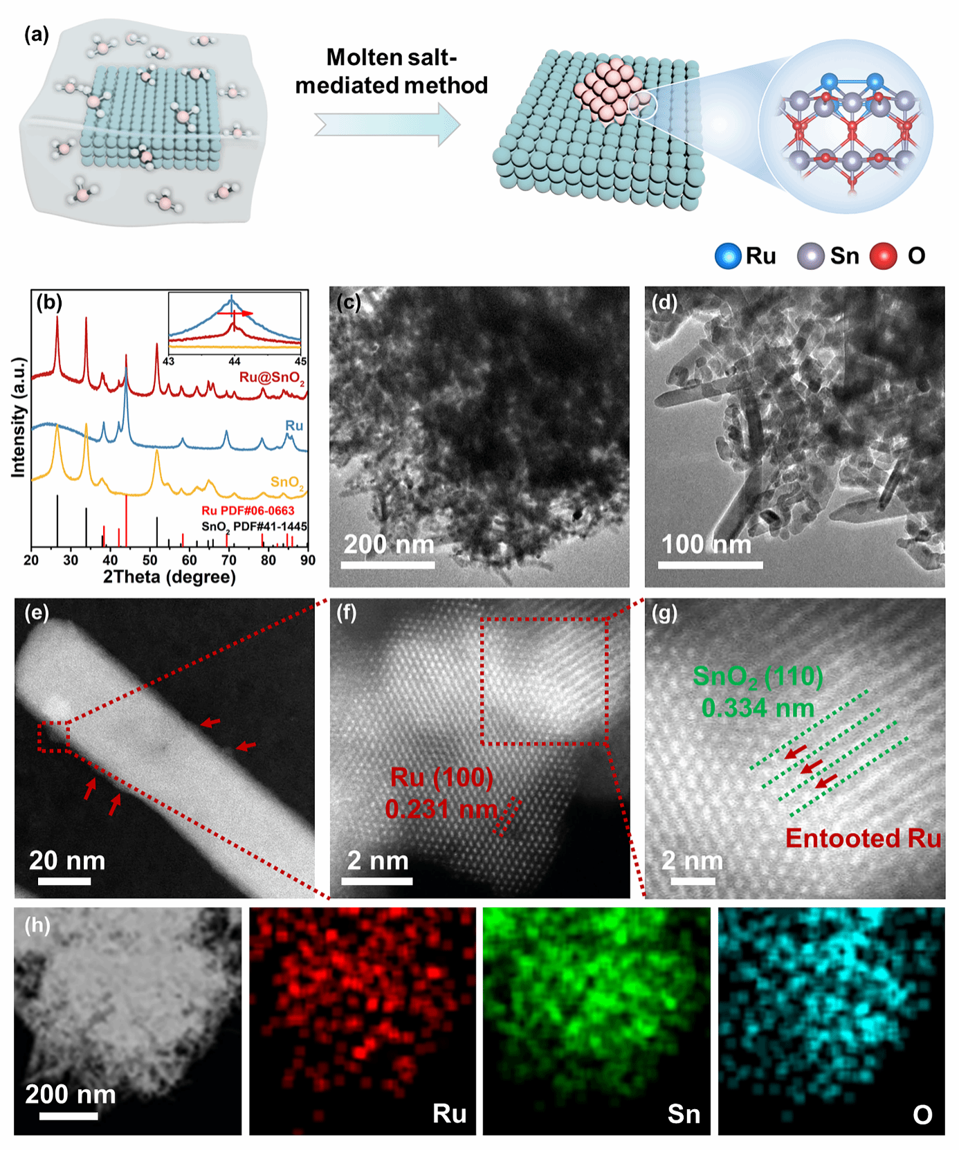 图1. Ru@SnO₂催化剂的合成策略与多尺度结构表征。(a) 本工作提出的熔盐辅助合成Ru@SnO2示意图,该方法实现了Ru团簇在SnO2晶格中的部分嵌入与限域。(b) Ru@SnO2、实验室自制的SnO2载体及Ru样品的X射线衍射图谱对比。(c) Ru@SnO2的透射电子显微镜图像和 (d) 高分辨透射电子显微镜图像,展示了其纳米棒形貌与清晰的晶格条纹。(e-g) Ru@SnO2的原子分辨率高角度环形暗场扫描透射电子显微镜图像,直观揭示了Ru团簇在SnO2晶格中的嵌入状态(水母状构型)。(h) Ru@SnO2的HAADF-STEM图像及相应的Sn、O、Ru元素分布图,证实了Ru在载体上的均匀分布。