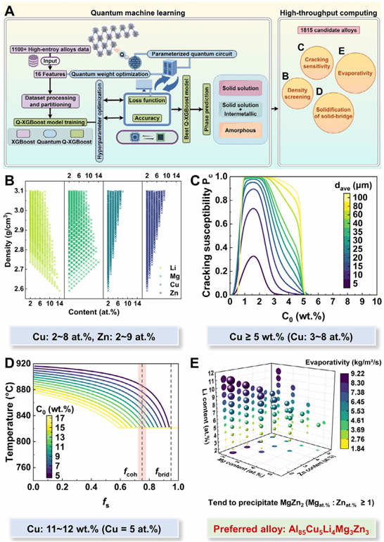 近日,福耀科技大学蒋建中教授团队联合北京科技大学、新加坡国立大学,在国际顶级材料学期刊 Advanced Science 发表突破性研究成果。团队以量子机器学习与高通量计算为创新手段,精准设计出可用于增材制造的Al₈₅Cu₅Li₄Mg₃Zn₃轻质铝基熵合金,在突破高强铝合金打印热裂难题的同时,实现了室温超强、高温高稳、轻质高强的多性能协同,为航空航天等极端工况关键构件提供了全新材料方案。