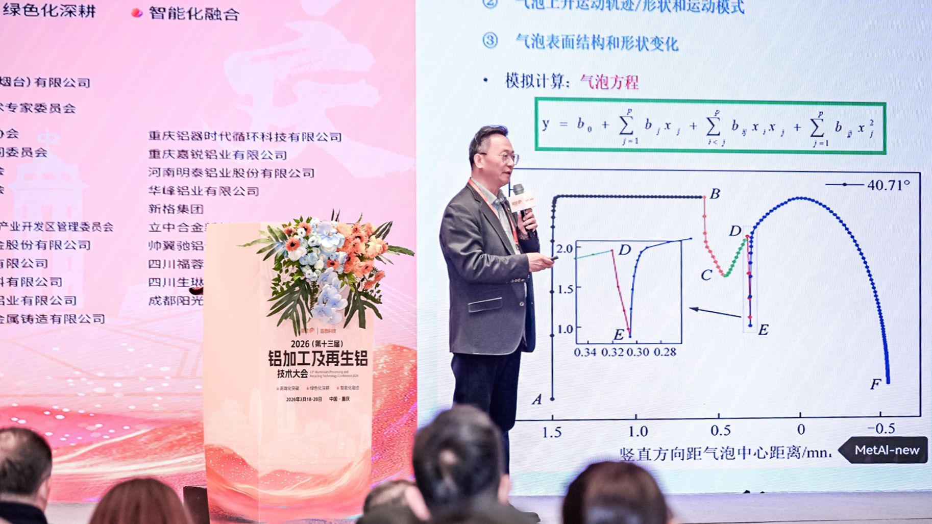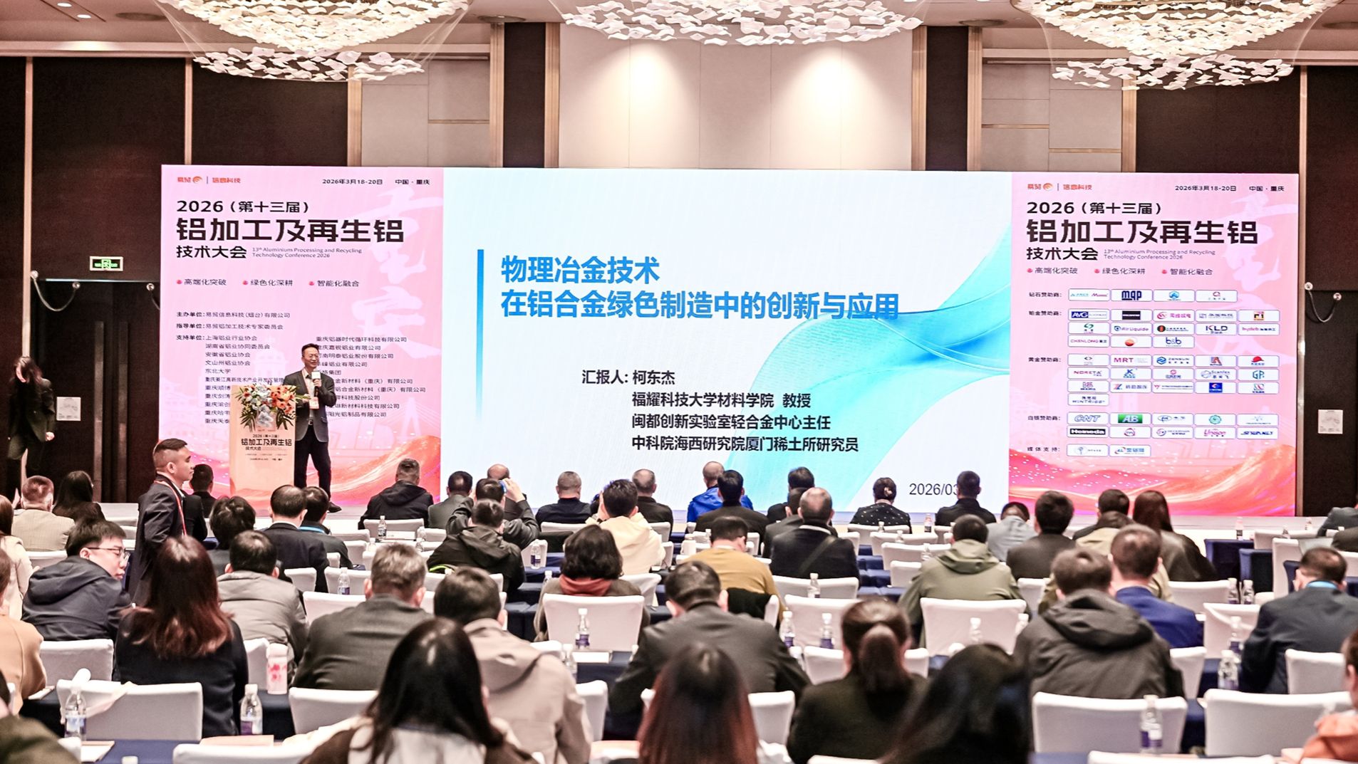 3 月 18-20 日,2026(第十三届)铝加工及再生铝技术大会在重庆隆重召开。本次大会以 “高端化突破 绿色化深耕 智能化融合” 为主题,汇聚了全国科研院所专家、企业工程技术专家及代表 460 余人,设置主论坛及 6 大专业分论坛,聚焦铝加工及再生铝行业技术创新与升级,为行业降本增效、低碳发展提供专业解决方案与交流平台。新材料新能源学院柯东杰老师受邀出席,并在大会主论坛作题为 “物理冶金技术在铝合金绿色制造中的创新与应用” 的专题报告,分享前沿技术成果,引发行业广泛关注与热烈反响。